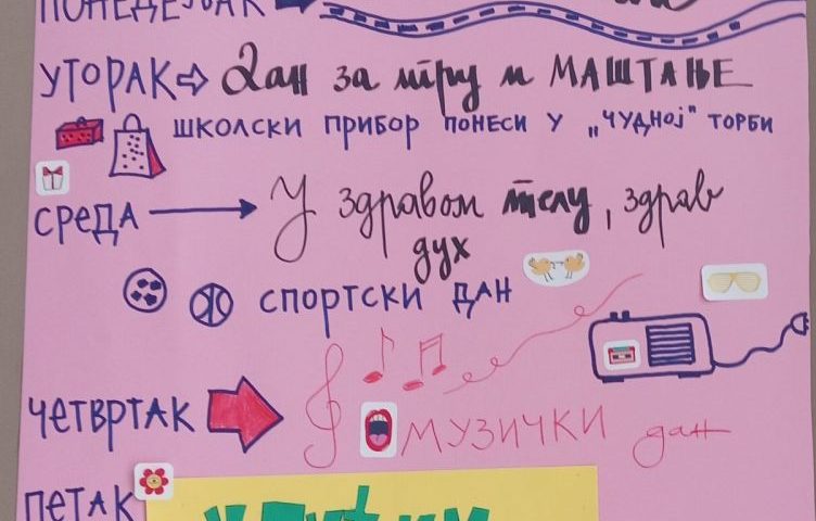Биће спорта, музике , игре и пре свега дружења смеха. Омиљени дан у Дечјој недељи свакако је петак када смо „у туђим ципелама“ – ученици постају наставници а наставници седају у школске клупе.